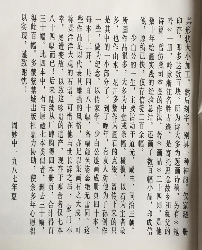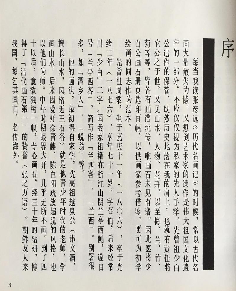 每當(dāng)我讀張彥遠(yuǎn)《歷代名畫記》的時(shí)候,常以古代名畫大量散失為憾。又想到藝術(shù)家的遺作是偉大的祖國(guó)文化遺產(chǎn)的一部分,不應(yīng)僅僅視為藝術(shù)家的先人手澤。先曾祖父少白公遺作的保管,既然歷史地落在我的肩上,也就有責(zé)任將它公之于世。又見山水、人物、花卉,以至梅、蘭、竹、菊等等,皆各有畫譜流傳,唯畫石未見有譜。因此愿將少白公畫石冊(cè)頁(yè)選印百幅,以供畫家參考借鑒,更可為初學(xué)繪畫的同志作為范本。
