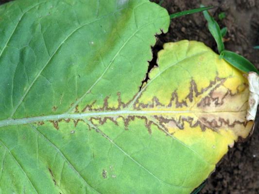 黃瓜花葉病則主要靠蚜蟲(煙蚜、棉蚜)傳播,其次是汁液擦傷傳病。由于這一種病毒寄生范圍極廣,可在越冬蔬菜及多年生雜草體內(nèi)越冬,成為來年侵染草的初侵染源。因而村邊、地頭煙株發(fā)病早、受害重。煙草自移栽到旺長階段,若遇雨天,溫度較低,蚜蟲數(shù)量多,將導(dǎo)致病害流行。