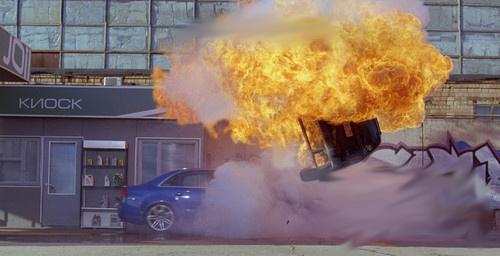 片中,裘洛對主角馬維不斷展開追殺,爆破場面中的莫斯科轉(zhuǎn)瞬置于一片火海。在追車戲之外,影片也再現(xiàn)了《黑客帝國》中經(jīng)典的子彈穿越場面。[1][3]