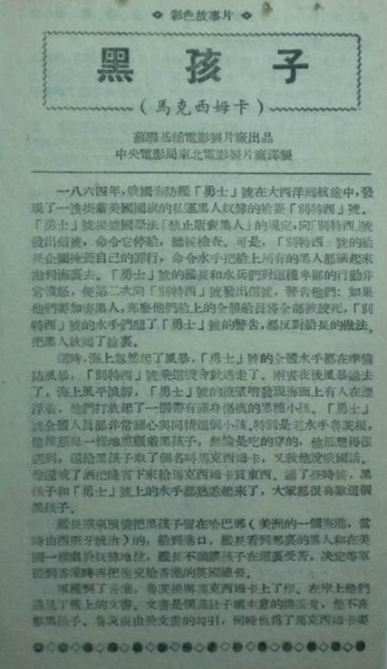 蘇聯(lián)電影《黑孩子》由基輔電影制片廠于1952年出品,由中央電影局東北電影制片廠于1953年譯制。影片改編自К·М·斯達(dá)紐科維奇所著《海洋故事》,由?!げ祭瓰鯃?zhí)導(dǎo),Б·安德列也夫、Н·克留奇柯夫、Т·保貝根、С·庫里洛夫,С·卡尤柯夫、?!ぐ屠T夫等領(lǐng)銜主演。