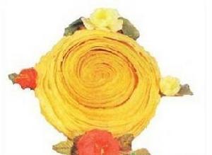 5、把烙好的盤絲餅晾10分鐘,用手擠促后,再把絲抖開,放入5寸的小盤內(nèi),撒上白糖、青紅絲。如食者愿吃咸的,可撒點精鹽。有的是將白糖、青紅絲、精鹽分別放入容器內(nèi),與抖好的盤絲餅一同上桌,食者可自由選擇。