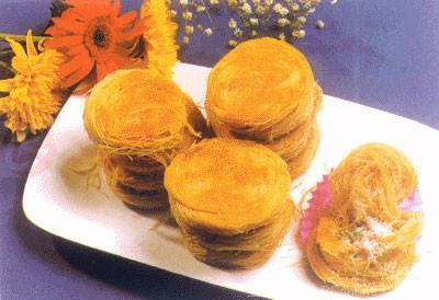 將和好的面“醒”一段時間后,把面團搓成長條,抓住長條的兩頭在案板和空中反復摔打。拉抻到一定程度后將條面切成15公分的小段,再反復拉抻至八九扣時,就形成了數(shù)百根細如發(fā)絲的“龍須面”,在上面刷一遍油后用刀截成數(shù)段,然后將面絲一圈圈盤成餅狀放在鏊子里烙制(烙制時還要刷上一層花生油)而成。吃的時候撒上白糖或青紅絲,用手捧著盤絲餅輕輕一擠,千條均勻的“金絲”宛如細細的菊花瓣輕輕散開。送入口中,頓覺外焦里嫩、香脆爽口。