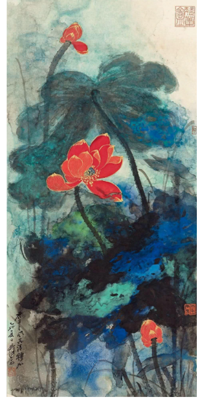 《潑彩荷花》由中國著名山水畫大師——張大千于1981年所創(chuàng)作,采用潑墨潑彩之技法,先將色彩潑在畫紙上,讓其色汁自然舒展、擴溶滲入紙背。然后蘸取墨汁,揮毫潑灑在宣紙上,看似信筆隨意,實質(zhì)技法老到,用意高妙,獨具匠心。
