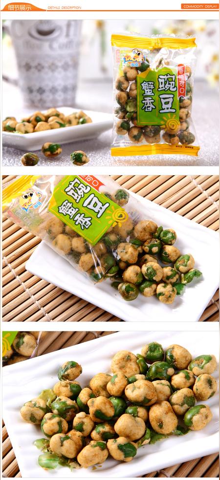 蠶豆作為一種傳統(tǒng)產(chǎn)品,我們經(jīng)過多年的研發(fā),在中國(guó)首創(chuàng)了“豆片”系列產(chǎn)品,我司采用從美HEAT & CONTROL公司引進(jìn)的油幕式精確油炸技術(shù),以及自由脫落式去皮前處理技術(shù)制造的豆片已被國(guó)內(nèi)廣大消費(fèi)者認(rèn)可,尤其是以太湖大閘蟹粉為基料的“蟹香豆片”,以獨(dú)特性,不可復(fù)制性,流行于大江南北。豌豆