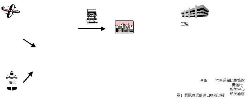 SCHENKER為悉尼奧運(yùn)會(huì)組織的進(jìn)口物流過(guò)程如圖1所示。公司從197個(gè)國(guó)家組織空運(yùn)1200噸,海運(yùn)40000噸,并通過(guò)倉(cāng)儲(chǔ)面積4000平方米、擁有3000個(gè)托盤(pán)貨位的倉(cāng)庫(kù)進(jìn)行存儲(chǔ)、分撥以及用汽車(chē)向比賽場(chǎng)館、奧運(yùn)村、新聞中心和相關(guān)酒店配送。