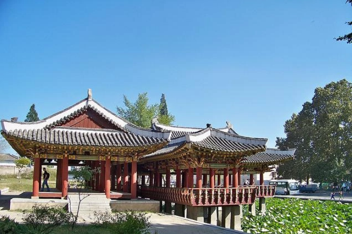 ??志歡亭:位于黃海南道的“首陽(yáng)山”(Mountain Suyang)上,原建于1790年,后來(lái)在50年代的朝鮮戰(zhàn)爭(zhēng)(朝鮮稱為:祖國(guó)解放戰(zhàn)爭(zhēng)) 時(shí),被入侵的美國(guó)軍隊(duì)破壞,后來(lái)依原樣仿效。這座亭紅柱綠瓦,它的一根柱子由一塊巨巖托起,巖縫涌出的“玉泉”,吸引許多觀光客來(lái)暢飲。