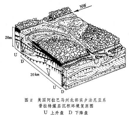 其中,障壁島后沼澤形成的煤層薄,含硫高,煤層沿障壁沙壩走向延伸;下三角洲平原的成煤沼澤順分流河道兩側(cè)的天然堤發(fā)育,形成的煤層沿沉積傾向連續(xù),走向不連續(xù),煤層薄,常見泥質(zhì)夾層;上三角洲平原至河流沖積平原的泥炭堆積在河道兩側(cè)的泛濫盆地中,煤層呈透鏡體狀,橫向連續(xù)性差,常為低硫煤;上、下三角洲平原過渡帶泥炭層發(fā)育在分流間灣被決口沉積物充填而成的廣闊平臺上,煤層厚度穩(wěn)定,橫向連續(xù)性也好。此外,沉積速度快的阿巴拉契亞南部,煤層穩(wěn)定性差,含硫低;北部沉降速度慢,煤系厚度小,煤層分布穩(wěn)定,含硫高。弗姆和G.A.懷森弗魯(1989)指出,向上變粗垂直層序厚度的差異主要是由于盆地深部同沉積斷裂活動引起?;壮两捣容^大的一側(cè)(下降盤)在地表造成負地形,易形成疊置的河流沙體;而相對沉降較緩的一側(cè)(上升盤)則易形成較厚的煤層,厚煤層向疊置的河流砂體的方向分叉、變薄以至尖滅(圖2)。