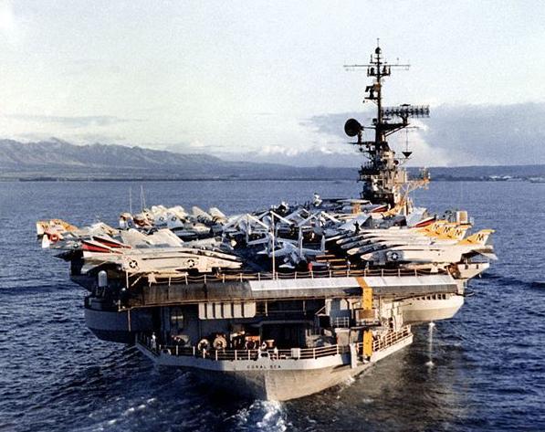 在接著十三年,珊瑚海號(hào)一直留在大西洋及地中海執(zhí)勤,并曾在蘇伊士運(yùn)河危機(jī)中協(xié)助撤走美國(guó)僑民。1960年,珊瑚海號(hào)調(diào)往太平洋艦隊(duì),并在1964年北部灣事件后開始參與越戰(zhàn)。此后十一年間,珊瑚海號(hào)一共八次部署到越南作戰(zhàn),參與了美軍多場(chǎng)重要戰(zhàn)事。
