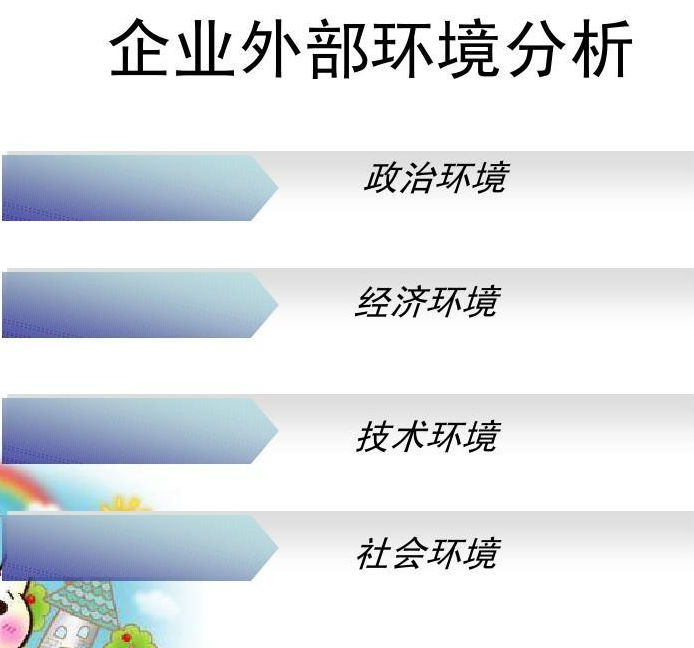 一般說來,隨著時代的發(fā)展,企業(yè)作為一個開放系統(tǒng),它所分析的外部環(huán)境因素會有越來越多、越來越多樣化的發(fā)展趨勢,因而企業(yè)所面臨的外部環(huán)境會變得更加復(fù)雜。
