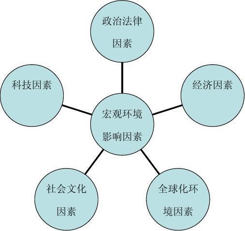 一般認為企業(yè)的宏觀環(huán)境因素有五類,即政治法律環(huán)境、經(jīng)濟環(huán)境、社會文化與自然環(huán)境以及技術(shù)環(huán)境。