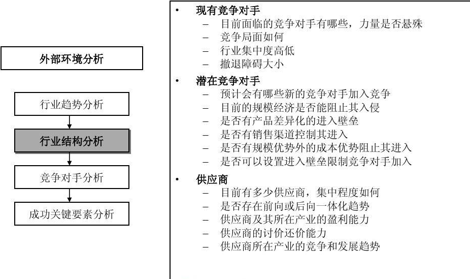 (6)成功關(guān)鍵因素。作為企業(yè)在特定市場獲得盈利必須擁有的技能和資產(chǎn),成功關(guān)鍵因素可能是一種價格優(yōu)勢、一種資本結(jié)構(gòu)或消費組合、或一種縱向一體化的行業(yè)結(jié)構(gòu)。不同產(chǎn)業(yè)的成功關(guān)鍵因素存在很大差異,同時隨著產(chǎn)品生命周期的演變,成功關(guān)鍵因素也會發(fā)生變化,即使是同一產(chǎn)業(yè)中的各個企業(yè),也可能對該產(chǎn)業(yè)成功關(guān)鍵因素有不同的側(cè)重。