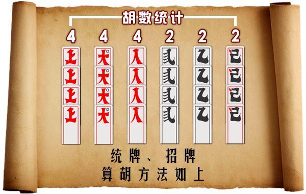 四張黑牌的基本胡數(shù)是2,有花乙或花九幾張的,則加幾。四張精牌的胡數(shù)需要特別記憶——有一定規(guī)律可循。