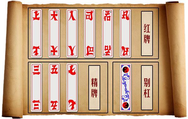 紅牌(6張牌面):上、大、人、可、知、禮,每個牌面各5張。精牌(3張牌面):三、五、七,每個牌面各5張,其中2張牌面是帶花邊的牌。