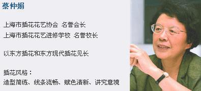一花一世界,一草一人生,蔡仲娟經(jīng)過幾十年的鉆研琢磨,在國(guó)內(nèi)外享有很高的知名度,成為著名的插花藝術(shù)家,出任中國(guó)插花花藝協(xié)會(huì)副會(huì)長(zhǎng)和上海市插花花藝協(xié)會(huì)會(huì)長(zhǎng)。2011年起,經(jīng)上海市插花花藝協(xié)會(huì)理事會(huì)討論通過,任命蔡仲娟女士為上海市插花花藝協(xié)會(huì)終身名譽(yù)會(huì)長(zhǎng)。