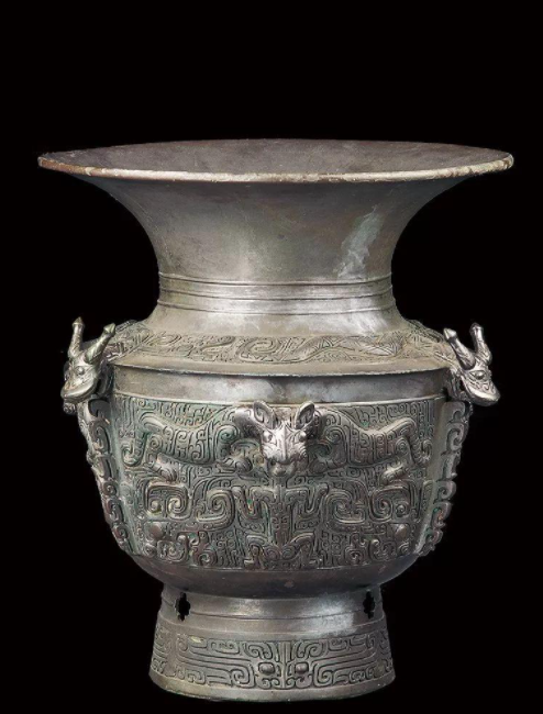 飲酒器,圓唇,腹部細(xì)長,高圈足,造型修長雅致,全器中部以下出棱。頸飾焦葉紋附以其他動(dòng)物紋飾裝飾,服飾饕餮紋,用夔紋裝飾眉毛。圈足飾兩組饕餮紋、蟬紋,以云雷文為底紋。此觚紋飾復(fù)雜奇麗,以主題紋飾、輔助紋飾和底紋組合而成。