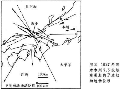 面。從每個(gè)臺站Si沿地震射線回溯到震源,都可在震源球面上找到一個(gè)對應(yīng)點(diǎn)S。在考慮到射線經(jīng)過反射或折射界面時(shí) P波壓縮、膨脹特性所可能受到的變換并作了適當(dāng)校正之后,將每個(gè)臺站記錄的 P波初動方向標(biāo)到震源球面上去。人們發(fā)現(xiàn),只要記錄足夠多,且臺站對應(yīng)點(diǎn)S在震源球面上的分布范圍足夠廣,則總可找到兩個(gè)互相垂直的大圓面將震源球面上的正、負(fù)號分成四個(gè)部分,即四象限,如圖1[P波四象限分布示意圖]左部所示。這兩個(gè)互相垂直的大圓面稱為 P波初動的節(jié)面,節(jié)面與地面的交線稱為節(jié)線,節(jié)面上P波初動位移為零。二節(jié)面之一 (AA′)與地震的斷層面一致,而另一個(gè)方面(BB′)稱為輔助面。事實(shí)上,對地表P波水平位移也觀測到指向震中和背向震中的象限分布特點(diǎn)如圖2[1927年日本本州7.5級地震引起的P波初動地動位移]。