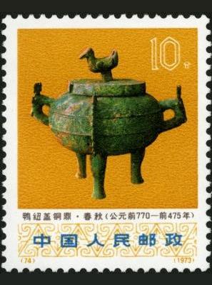 【鴨紐蓋銅鼎】春秋時(shí)代是我國(guó)歷史上一個(gè)大變革時(shí)代,隨著文化的發(fā)展,技術(shù)的提高,社會(huì)的進(jìn)步,各種器物也都從粗壯笨拙,逐漸變得體型輕巧,紋飾精細(xì)。鼎,相當(dāng)于現(xiàn)在的大鍋,是一種烹飪器皿,多用于煮牲。郵票畫(huà)面上的這只銅鼎,造型玲瓏精巧,鴨形紐蓋逼真生動(dòng),改變了殷商、西周時(shí)期銅鼎那種威嚴(yán)、沉重的風(fēng)格,是春秋時(shí)期青銅器的代表作品。
