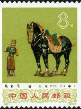 【黑彩馬】在唐代以前,我國(guó)陶瓷大多是單一的釉色。而所謂三彩是指多色,在同一件陶器上,黃、綠、白或黃、綠、藍(lán)、赭等釉色交錯(cuò)使用,它是以白色粘土作胎,用含銅、鐵、鈷、錳等金屬元素的礦物為釉料呈色劑,以鉛的氧化物助熔,經(jīng)800。C高溫?zé)贫?,由于釉質(zhì)流動(dòng)浸潤(rùn),使之色彩斑斕,絢麗華美。以人物和動(dòng)物造型的唐三彩又構(gòu)成了富有特色的雕塑藝術(shù)。三彩陶器以西安、洛陽(yáng)兩地唐墓中出土最多。郵票畫(huà)面上的這匹黑彩馬高66.8厘米。1971年在河南洛陽(yáng)關(guān)林唐墓中出土,除頭部、馬蹄及尾部為黃色外,通體都是黑色。馬鞍綠色,釉色豐潤(rùn),立馬稍稍扭頸,神態(tài)逼真。牽馬俑似在持韁,生氣盎然。二者形神俱佳,相映成趣,是已發(fā)現(xiàn)的唐三彩中的佳作。