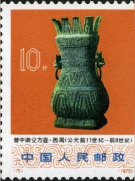 【曾中游父方壺】壺是盛酒或盛水的器物,也是古代的禮器?!对?shī)經(jīng)》上有“清酒百壺”的詩(shī)句。有圓形、方形等狀,盛行于春秋戰(zhàn)國(guó)時(shí)期。郵票畫(huà)面上的方壺,通高65.6厘米,于1966年7月在湖北省京山縣鄭家河水庫(kù)出土。長(zhǎng)頸,壺肩上有兩個(gè)伏獸銜環(huán),體形扁方,上口和下底均為長(zhǎng)方形。有蓋,蓋上有高聳的蓮瓣形裝飾。蓋邊及頸中部各飾竊曲紋足一周,頸、腹飾環(huán)帶紋和重鱗紋。壺上有曾中游父自作器的銘文。這枚郵票下面的說(shuō)明文字“曾中游父方壺·西周”有誤,據(jù)專家考證,此壺產(chǎn)于春秋,而非西周。