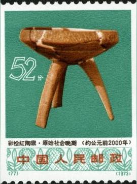 【彩繪紅陶鼎】原始社會(huì)晚期,手工業(yè)和農(nóng)業(yè)逐漸分離成為獨(dú)立的生產(chǎn)部門(mén),這時(shí)的制陶業(yè)從制作、燒造技術(shù)到經(jīng)營(yíng)管理都發(fā)生了深刻變化。陶制的三足鼎、斝、爵,袋狀足的鬻、盉、鬲,圓足的豆等等都已經(jīng)成為普遍使用的炊器、食器。在陶器未焙燒前,以紅、黑、白簡(jiǎn)單色彩描繪紋飾,燒后彩紋不脫落的彩陶不僅有實(shí)用價(jià)值,而且是杰出的工藝美術(shù)品。郵票畫(huà)面上的這件紅陶鼎高29.1厘米,口徑29.8厘米。1974年4月在山東鄒縣城南野店村原始社會(huì)晚期遺址出土,屬于中期大汶口文化類型。為夾砂紅陶缽狀盛器,無(wú)耳,三足圓鼎。近底處向外伸出三條鴨嘴形的足,使鼎支撐平穩(wěn),便于炊煮架燒,堪稱幾何學(xué)的“三點(diǎn)成一面”的最早應(yīng)用。鼎口沿外繪白色網(wǎng)狀紋一周,是魚(yú)網(wǎng)的藝術(shù)再現(xiàn),此鼎為中國(guó)古代文明的重要標(biāo)志。