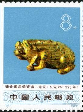 【鎏金鑲嵌銅硯盒】用金銀鑲嵌的工藝品,在西漢時(shí)已經(jīng)出現(xiàn)。郵票畫(huà)面上的這件銅硯盒長(zhǎng)25厘米,寬13厘米,高9厘米,1969年5月在江蘇省徐州市土山東漢墓出土,又叫嵌石獸形銅硯。形如青蛙,但頭部又如獅似虎,額上兩角,身長(zhǎng)兩翼,張口逼視,十分兇猛,恐即為古人所謂之“辟邪”。《急就篇》中說(shuō):“辟邪除群兇?!惫糯R(shí)分子把此物置于書(shū)案,大有避禍消災(zāi)之意。此硯自口部經(jīng)下腹至臀部一剖為二,上為蓋,下為硯盒,銅質(zhì)鎏金,文飾精密,通體鑲嵌近百顆紅珊瑚、綠松石、青金石,雖深埋地下,歷經(jīng)千年,但仍金光閃閃,堂皇富麗,實(shí)為我國(guó)古硯中之珍品。