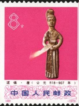 【泥傭】俑是中國(guó)古代陪葬用的偶像,一般多用木制或泥制,也有石雕的。我國(guó)的陶俑藝術(shù)可以追溯到遠(yuǎn)古,震驚世界的秦始皇陵兵馬俑便是古人的一大杰作。而到了隋唐時(shí)期,更是盛極一時(shí)。新中國(guó)成立以后出土了大量的唐代陶俑,其中初唐時(shí)的女俑身材俏瘦,亭亭玉立;而中唐以后,便體態(tài)豐腴,儼然貴婦,反映了當(dāng)時(shí)文化藝術(shù)的演變和審美觀的變化。郵票畫(huà)面上的女俑面部豐腴,眉清目秀,發(fā)髻高聳,兩手合抱,系在腰間的帶子隨風(fēng)飄動(dòng),使形象更為逼真生動(dòng)。