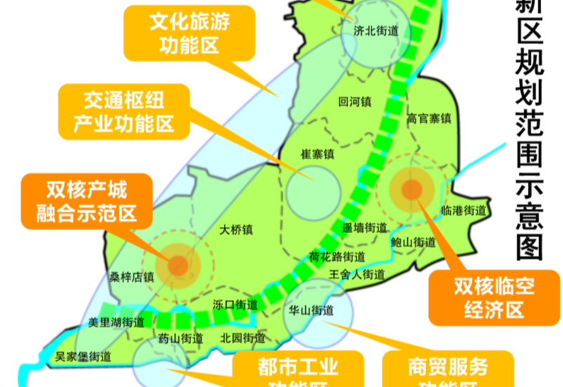 濟(jì)南新區(qū)黃河南岸則以黃河和小清河及濟(jì)廣高速中間區(qū)域?yàn)橹饕秶?,涉及槐蔭區(qū)美里湖、吳家堡街道,天橋區(qū)藥山、濼口、北園街道,歷城區(qū)華山、荷花路、遙墻、王舍人、鮑山、臨港街道(含董家街道部分區(qū)域),章丘區(qū)高官寨鎮(zhèn)相關(guān)區(qū)域,共300平方公里。