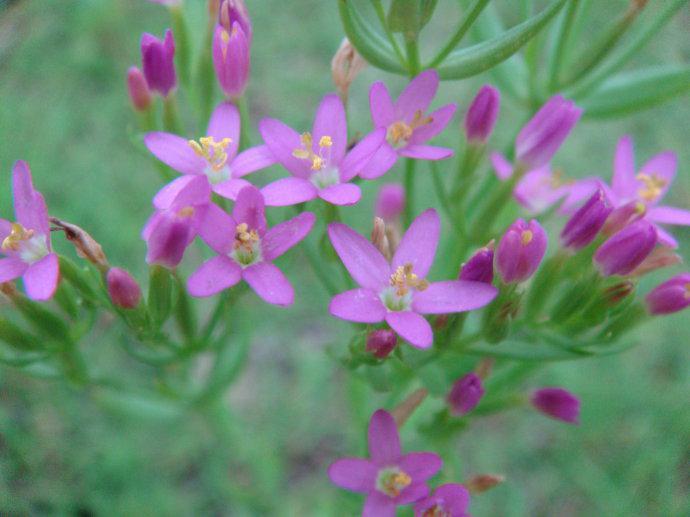 百金花,學(xué)名Centaurium Pulchellum (Swartz) Druce var. altaicum (Griseb.) Hara,所屬龍膽科,百金花屬,國內(nèi)分布于西北、華北、東北、華東至華南沿海等地,生于濕草甸。與原變種的區(qū)別是花具明顯花梗,花萼裂片鉆形,中脈在背面高高突起呈脊?fàn)?,花冠白色或粉紅色。生于潮濕的田野、草地、水邊、沙灘地,特別在海邊最多,海拔50-2200米。模式標(biāo)本采自阿勒泰地區(qū)。