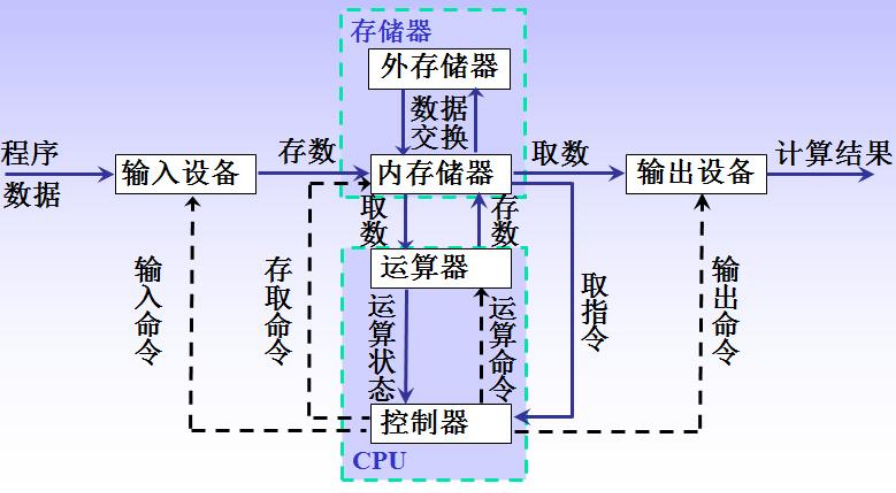 (1)計(jì)算機(jī)由運(yùn)算器、控制器、存儲(chǔ)器、輸入設(shè)備和輸出設(shè)備五部分組成。(2)采用存儲(chǔ)程序的方式,程序和數(shù)據(jù)放在同一個(gè)存儲(chǔ)器中,指令和數(shù)據(jù)一樣可以送到運(yùn)算器運(yùn)算,即由指令組成的程序是可以修改的。