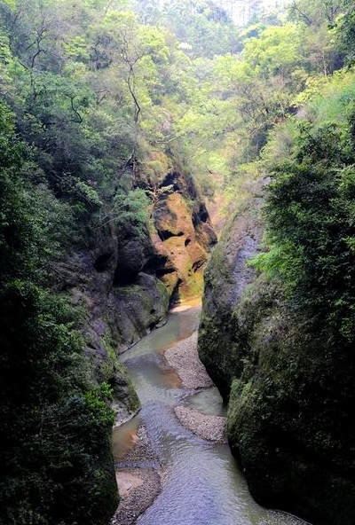 天成奇峽的獨特景觀,是同一座山上相隔不足百米有兩道一線天,故名雌雄一線天,從下往上望,但見一線天光,狹窄之處須側(cè)身而過。游人可以從雌一線天往山頂?shù)?,從雄一線天下來。