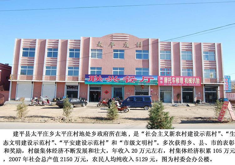 建平縣太平莊鄉(xiāng)太平莊村地處老哈河?xùn)|岸,金張線公路縱貫全境,西距錦赤鐵路汐子站5公里,交通便利,環(huán)境優(yōu)越。村年集體經(jīng)濟總收入20萬元左右,村級集體資產(chǎn)105萬元,全村社會總產(chǎn)值2150萬元,農(nóng)民人均純收入5129元。