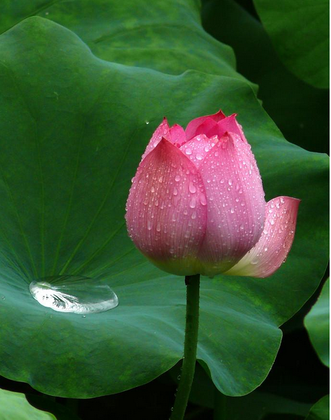 隨著腳步的臨近,荷花的“嬌面”開(kāi)始清晰:“粉顏珠飾碧羅裙”。詞人僅用7個(gè)字,以擬人的說(shuō)法,描寫(xiě)了荷花“粉顏”的花容,佩戴的珍珠飾品,“碧羅裙”的著裝,一個(gè)完整的光彩照人的“美女”形象,從而達(dá)到深化荷花花朵嫩白桃紅的色彩,荷花荷葉上晶瑩剔透而滾動(dòng)發(fā)光的水珠,微風(fēng)中輕輕擺動(dòng)的碧綠荷葉等魅力無(wú)窮的荷花形象。上闋的正面描寫(xiě)由此而止。