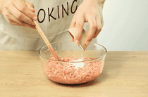 步驟一 | 肉碎放入大碗中,并放入雞蛋、醬油、鹽、花椒粉,然后順著一個方向攪拌。 |