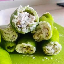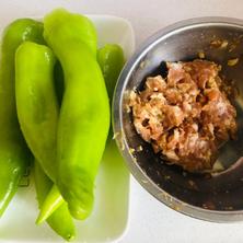 步驟二 | 尖椒洗好去蒂一切兩半,將肉餡填到尖椒里面。 |