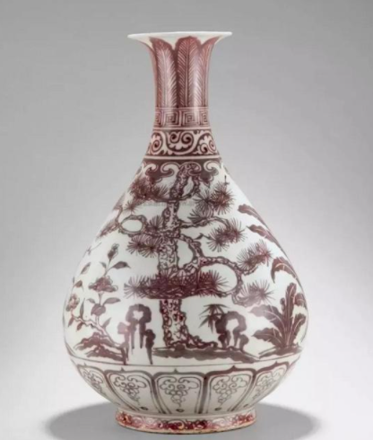 明洪武時期的釉里紅瓷器多為大盤、大碗、大罐、玉壺春瓶、梅瓶、執(zhí)壺等大件器物,紋飾以各種纏枝、折枝和串枝花卉為主,此外還有松竹梅、庭院芭蕉及龍鳳等紋飾。此時期的釉里紅發(fā)色不甚鮮艷,多為紅中偏灰黑的色調(diào),此壺發(fā)色較為鮮艷純正,是一件難得的珍品。