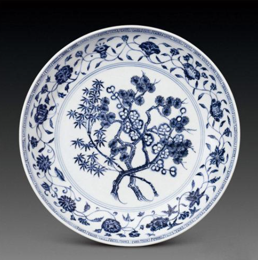 洪武官窯青花主要使用含鐵量低、含錳量高且淘煉欠精的國產(chǎn)青料,呈色青中帶有灰色調(diào),偏淺灰色,有部分鐵銹斑深入胎骨,這是由于鈷料中含有金屬錳、鐵等雜質的緣故。一部分呈現(xiàn)淡藍色,色澤穩(wěn)定,無暈散,色澤濃密處常能見到散布著一些小雜質點,反倒表現(xiàn)出青花的層次。還有一部分是淺淡色中含深藍點,有少量暈散。洪武青花不同于典型的至正青花的背翠艷麗,也不同于典型永樂、宣德青花的濃艷色譯而有自己的特點。明代永樂、宣德青花多采用進口蘇麻離青料燒制,色彩濃艷的背花紋飾泛出點點銀黑色結晶斑。這種青料比國產(chǎn)青料鐵的含量豐富,錳含量低。事實證明,青花料若不罩在釉下燒出后則為黑色,近似唐代時耀州窯白地黑色的作品;如果罩在釉下燒制,成品則為灰藍色。