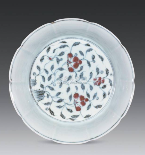 菱花口盞托直徑大約20厘米左右,寬板折沿菱花口,淺弧壁,外壁作八瓣蓮花形,盞托內(nèi)心有一道菱,用以放置固定杯盞。淺圈足,為洪武時期獨有形制。