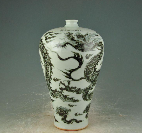 龍紋大多以云龍紋繪飾,形象不如元代兇猛。龍頭小、細頸、蟒身、作騰飛狀,頭部描繪簡單,獨角或雙角,龍頭大多有后掠的披發(fā),晚期繪有豎發(fā)。爪有三爪至五爪的,三爪較多,爪之間繪得較分開,呈車輪狀。鱗呈小圓弧形,留白邊,立體感強烈。常伴有云紋,云形粗短,呈品字形排列,向一側彎曲。