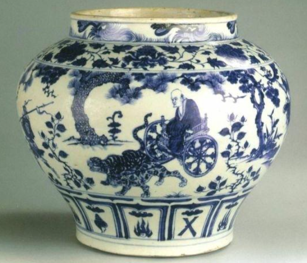 此壺造型優(yōu)美,紋飾線條流暢,一氣呵成。在裝飾風格上一改元代紋飾繁密的特點,布局漸趨疏朗,采用分層裝飾的手法,繪畫粗獷而不失工整,具有鮮明的時代特征。