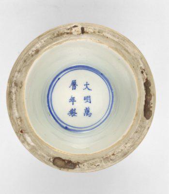 官窯器大多書青花“大明萬歷年制”雙行六字楷書雙圈款,很少使用“萬歷年制”四字款,只有和其他字句合用的,如“古周饕餮,萬歷年制”、“萬歷年制,純忠堂用”等。民窯器年號款有“大明萬歷年制”、“大明萬歷年造”、“萬歷年制”三種。除年號款外也有古語款、贊頌款、圖記款等,有“福”、“祿”、“壽”、“萬福攸同”、“金玉滿堂”、“玉堂佳器”、“富貴佳器”、“天祿佳器”等。