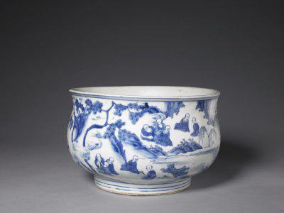天啟青花瓷中的人物紋飾比較具有時代特點,歷史人物圖紋飾較常見,這一時期,階級矛盾和民族矛盾使得社會更加動蕩,大明王朝正在風雨中飄搖,陷入內(nèi)憂外患、窮途末路的境地。官窯的幾乎停頓使得大部分制瓷技工涌向民窯,民窯相對寬松的創(chuàng)作環(huán)境,使得青花瓷工匠可以自由發(fā)揮自己所擅長的繪畫內(nèi)容,更易吸取當時文人繪畫的影響,對于青花瓷人物紋飾題材的選擇便是這種自由性開放現(xiàn)狀的產(chǎn)物。