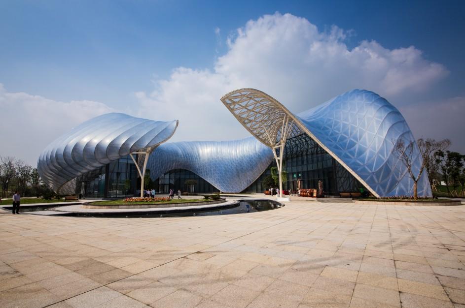 常州武進(jìn)管委會(huì)大樓是江蘇省綠色示范建筑。大樓富有富有戲劇性的形象是項(xiàng)目可持續(xù)規(guī)劃的一部分。連同所推薦的遮陽(yáng)系統(tǒng)和立面系統(tǒng),該形體的自我遮陽(yáng)形態(tài)有效地減少了外墻的熱負(fù)荷峰值。第八屆中國(guó)花卉博會(huì)展館