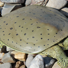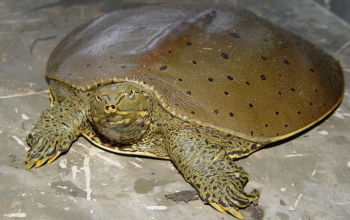 角鱉背甲圓形,呈橄欖綠色,具有黑色眼斑狀斑紋,背甲表面如砂質(zhì)般粗糙,因其背甲前緣有棘狀突起,所以又稱刺鱉;