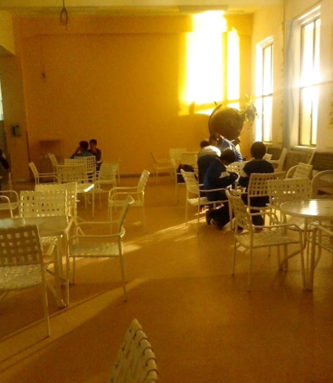 休息區(qū)建校時(shí)該校特意向美國(guó)學(xué)校學(xué)習(xí),開設(shè)休息區(qū)。這里的桌椅不是課堂的桌椅,而是類似于咖啡廳的桌椅,學(xué)生、老師們可以在這里討論課題、研究學(xué)習(xí)。