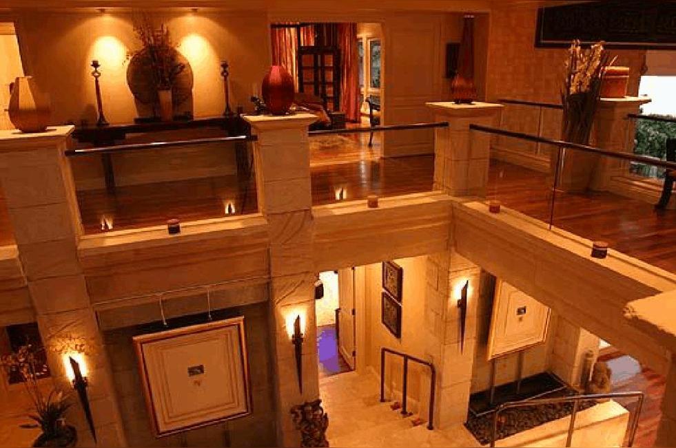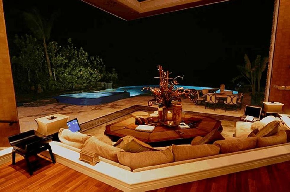 部分埋于地下的會客大廳可以容納150人晚餐,或者容納200人的雞尾酒派對。一邊墻是個6英尺寬的石灰石火爐,另一邊則是由24塊40英寸屏背投電視組成的22英尺寬的電視墻。旁邊是另外一個專門為會客廳服務(wù)的高檔廚房。