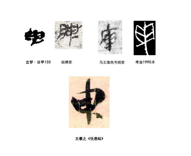《憂懸帖》“不能須臾忘心”的“臾”的寫法,列舉:1、戰(zhàn)國末年的云夢睡虎地秦簡《日書》甲種“臾”字(日甲135,出土于湖北省云夢縣);