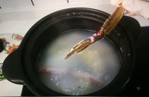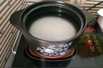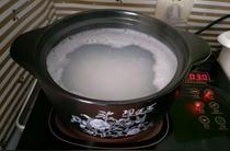 - 4.取砂鍋,倒入水,下入香米糯米,將粥煮開。