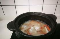 3、砂鍋內(nèi)的粥煮開后調(diào)至中火,再煮10分鐘,放入螃蟹塊、海蝦、姜末。