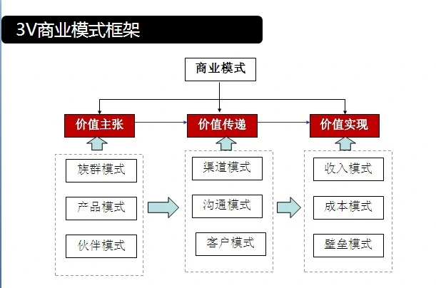 :商業(yè)模式既是戰(zhàn)略,同時又是戰(zhàn)略的實現(xiàn)!既然商業(yè)模式本質(zhì)是創(chuàng)造價值,那么,在模型的構(gòu)建中,“價值”(Value)就是一個重要的模塊。企業(yè)通過其產(chǎn)品和服務(wù)所能向消費者提供的價值被稱為價值主張。企業(yè)必須要圍繞價值主張構(gòu)建價值傳遞的網(wǎng)絡(luò),使價值得以實現(xiàn)。所以,價值傳遞必須有效(Validity),以實現(xiàn)商業(yè)模式的成功(Victory)。商業(yè)模式模型的三個模塊“價值主張、價值傳遞及價值實現(xiàn)”,其對應(yīng)的要求依次是“Value(價值)——Validity(有效)——Victory(成功)”;在此,析易國際商業(yè)模式研究院將其稱為3V模型。