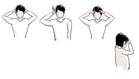 1、雙掌擦頸:十指交叉貼于后頸部,左右來(lái)回摩擦100次。